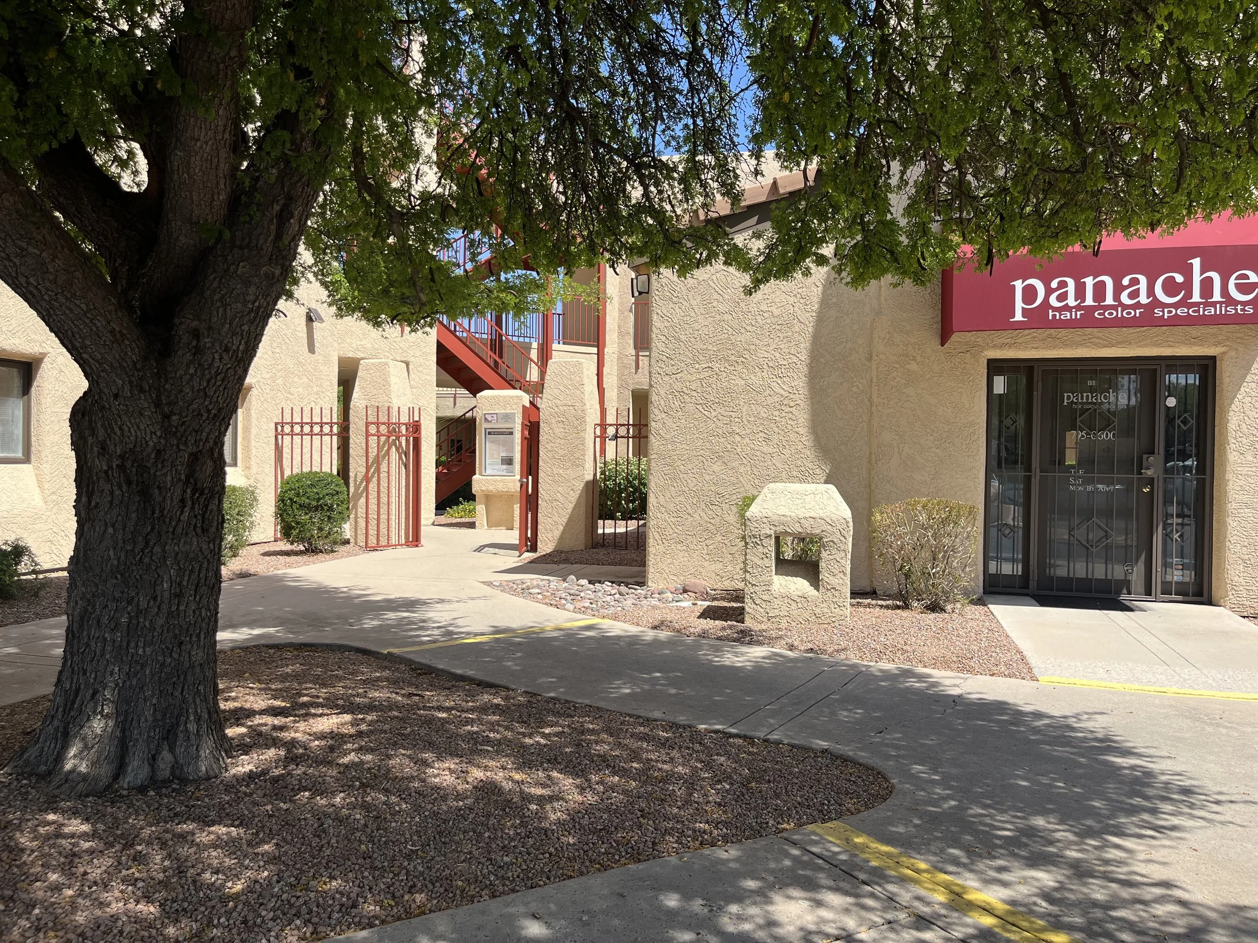 Office suite is just inside this courtyard entrance. Look for Panache, and go through the gates. Veer left and suite 102 is the very first office.