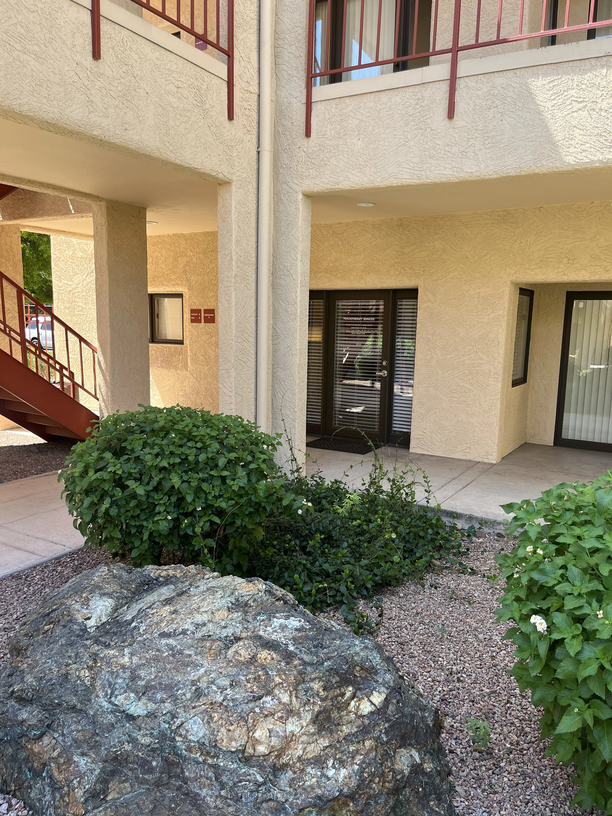 The front door of suite 102!. You’ll find the office at the base of the stairs when you enter the courtyard to the left of Panache.